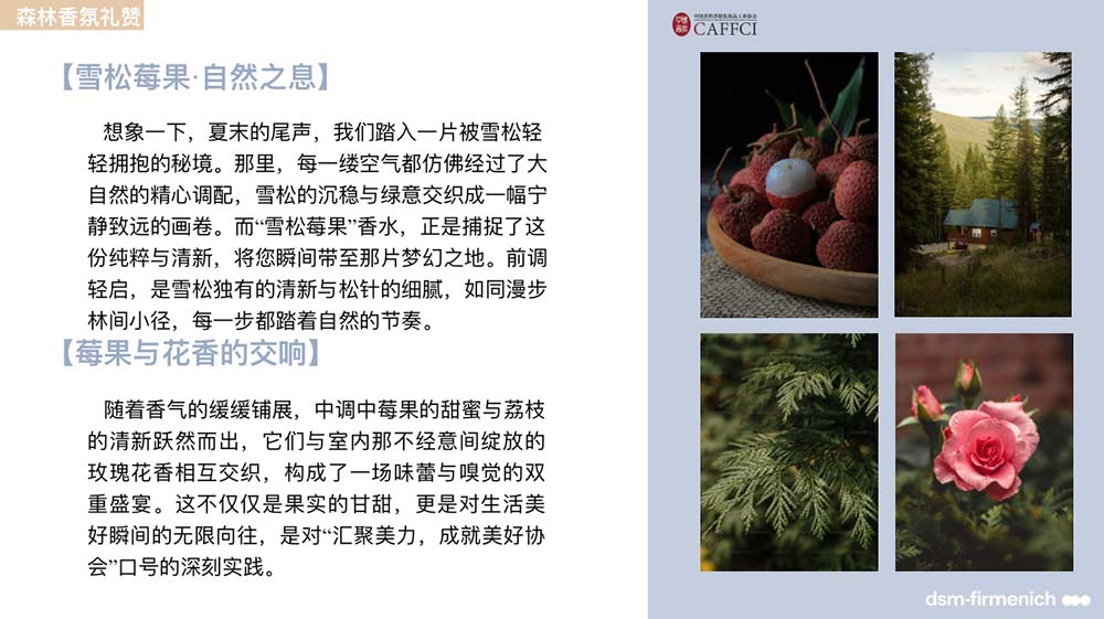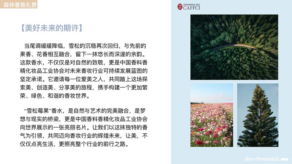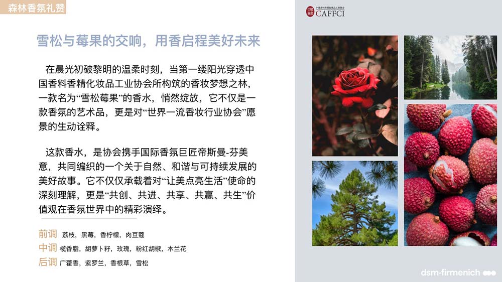 首先,“雪松莓果”香水的诞生是自然的馈赠与艺术的创造,是中国香妆协会与国际香氛巨匠帝斯曼-芬美意的合作结晶。
