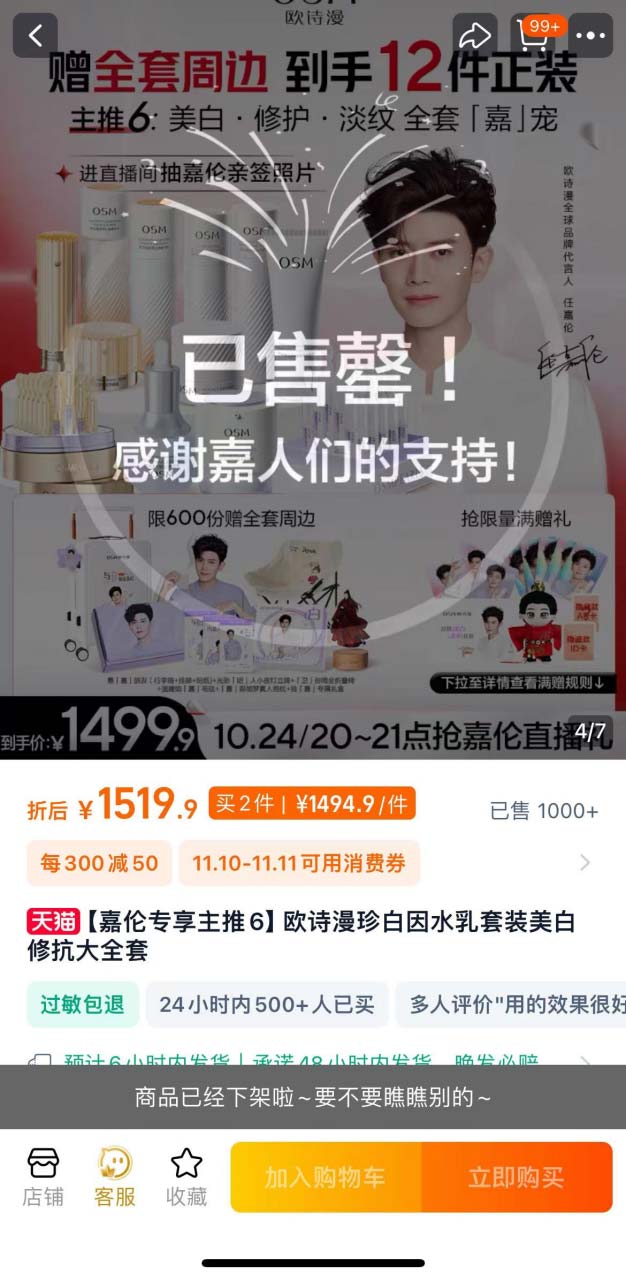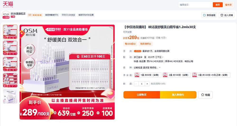 此外,欧诗漫还与众多头部直播和多位明星合作,构建了一个强大的传播矩阵,通过自播和达播的结合,实现了全网全渠道的营销覆盖。参加多个头部达人直播间,预售期发放超额优惠福利,在平台推出的满300减50的满减活动和各类优惠的基础上,欧诗漫进一步优化了产品机制,使消费者能够享受到更加优惠的价格。