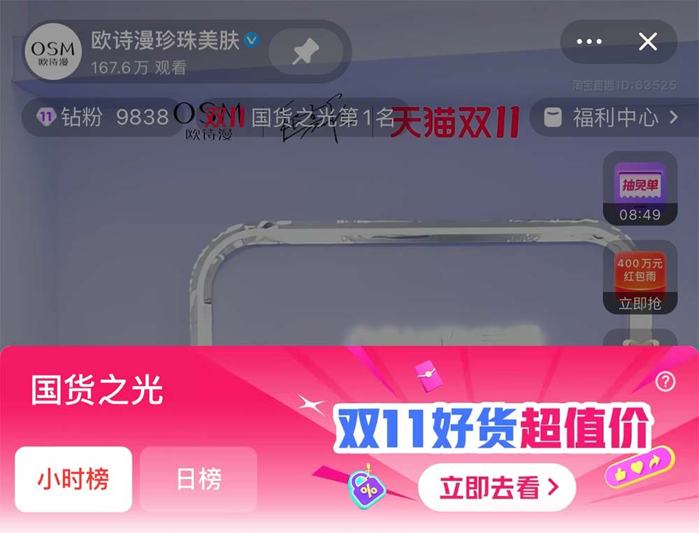在双十一期间,欧诗漫自播间的红包雨活动比日常增加了三倍,10月24日全球品牌代言人直播当天,欧诗漫发放了总金额高达400万的大额红包雨,引发了一场热烈的抢购热潮,创单日销售历史新高,更是在淘宝直播国货之光排位赛中赢得断崖式第一,1499产品大套组上线即售罄。通过创新直播的形式、主播亲自试用推荐和空前的优惠机制,欧诗漫降低了消费者决策成本,使购物体验更精准便捷。通过高效的即时沟通,提升了用户的购物体验,增强了消费信心,实现了品牌与消费者之间的“双向奔赴”。