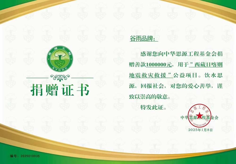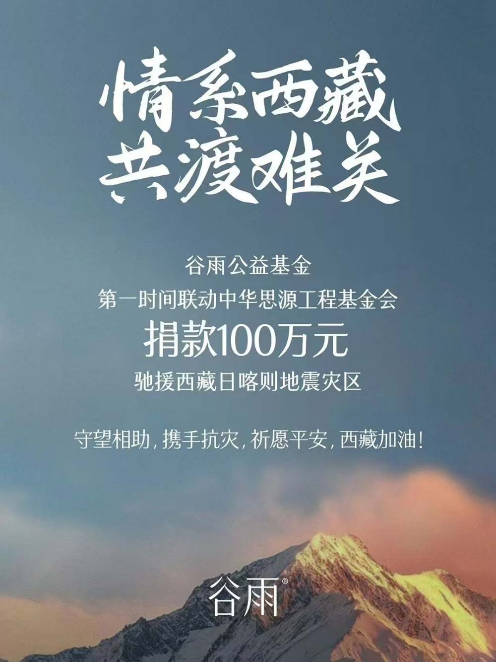 谷雨公益基金第一时间联动中华思源工程基金会,捐款100万元驰援西藏日喀则地震灾区。“情系西藏,共渡难关”,谷雨用实际行动诠释着企业的社会责任与担当,为灾区人民送去温暖与力量,祈愿西藏平安,与灾区人民守望相助,携手抗灾。