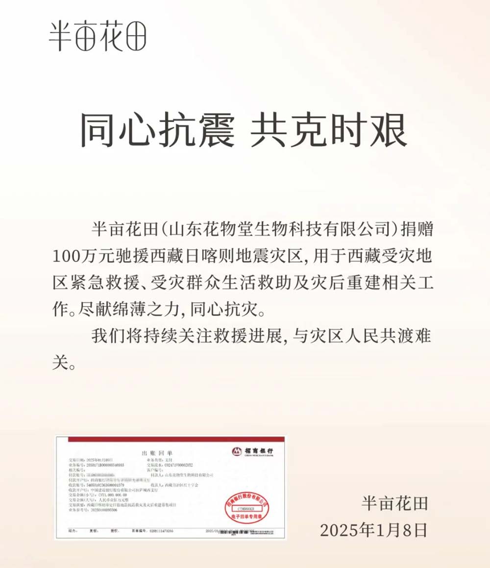 半亩花田(山东花物堂生物科技有限公司)也迅速响应,捐赠100万元驰援西藏日喀则地震灾区,这笔款项将用于西藏受灾地区紧急救援、受灾群众生活救助及灾后重建相关工作。“同心抗震,共克时艰”,半亩花田尽献绵薄之力,持续关注救援进展,与灾区人民共渡难关。