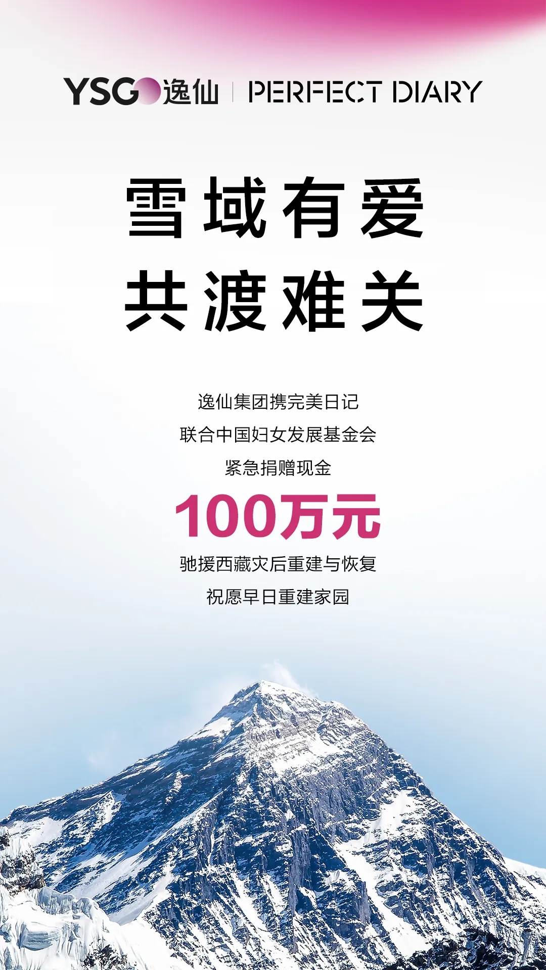 2025年1月7日,西藏自治区日喀则市定日县发生6.8级地震,灾情牵动着我们的心。 逸仙集团携旗下品牌完美日记,联合中国妇女发展基金会向西藏受灾地区捐赠100万元人民币,驰援灾后重建与恢复。 雪域有爱,共渡难关。逸仙集团将密切关注灾情救援进展,为灾区同胞们提供力所能及的帮助,祈愿平安!
